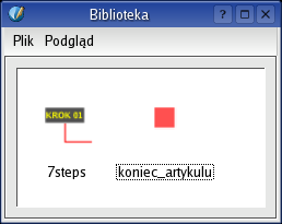 Otwórz w menu . Wyświetli się okienko dialogowe zwane Biblioteką, służące do przechowywania często używanych elementów. Przeciągnij i upuść etykietę nad okienkiem biblioteki. Przeciągnij tam również czerwony kwadracik kończący artykuł. Przeciągaj etykietę z biblioteki i upuszczaj ją obok innych figur, edytuj tekst, rysuj lub edytuj czerwone linie łączące etykiety z figurami i baw się przy tym dobrze.