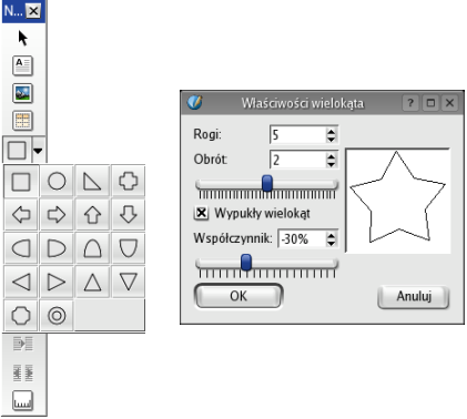 [Figury dla tekstu] Rysowanie figur jest proste. Kliknij i przytrzymaj ikonę prostokąta na listwie narzędzi, a zobaczysz ponad 16 różnych figur, które można tworzyć przez klikając i ciągnąc myszą. Kliknij na narzędzie Wielokąt, a będziesz mógł nawet rysować gwiazdy z taką ilością rogów, jaką sobie zażyczysz, oraz z innymi opcjami. Dla każdej figury wybierz kolor wypełnienia „Brak” i kolor obrysu „Black”. Grubość i styl linii znaleźć można w karcie palety , gdzie wybrałem ciągłą linię o grubości 1 punkta. Poszukaj stylów i opcji, które będą odpowiadały twoim wyobrażeniom. Układ graficzny strony wygląda dobrze, ponieważ wszystkie figury wyrównane są zawsze do dwu przypadkowo wybranych pionowych linii pomocniczych. Dzięki temu szerokość każdej figury jest wielokrotnością 11mm, ponieważ linie pomocnicze oddalone są wszystkie od siebie o 11mm.