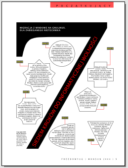 [Obrócony tekst] W nowej ramce tekstowej wpisz czerwoną czcionką, dużymi literami „Siedem kroków do informatycznej wolności”. Otwórz kartę palety i obróć ramkę o 60 stopni. Dopasuj kąt obrotu, aby tekst wpasował się idealnie. Dodaj teksty w innych ramkach tekstowych i strona jest gotowa.