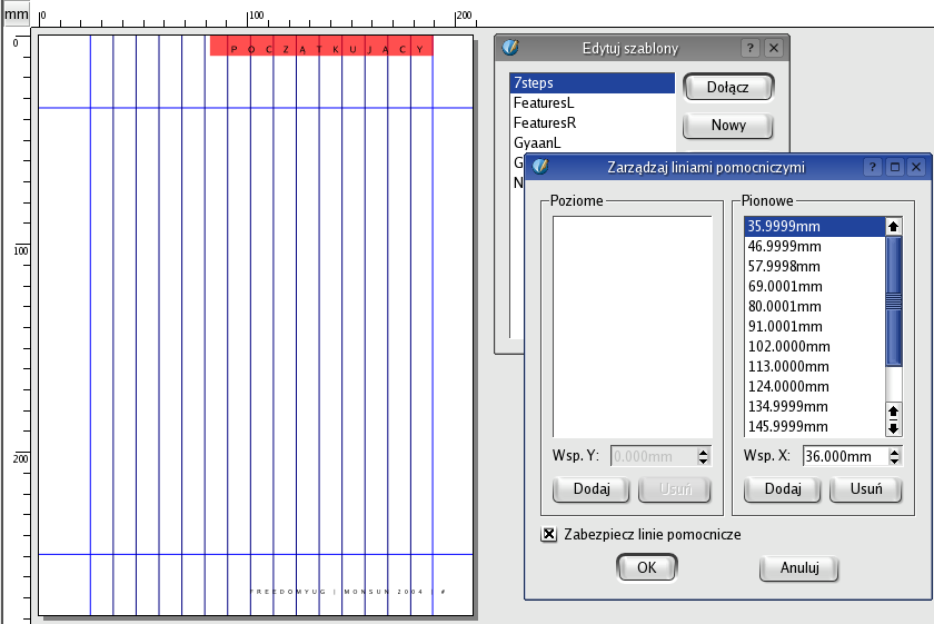 [Pomoce wizualne] Projekt strony zawiera aż piętnaście szpalt, do których wyrównane są zawarte w nich elementy. Otwórz w menu Dodaj pionową linię pomocniczą o współrzędnej 36mm.