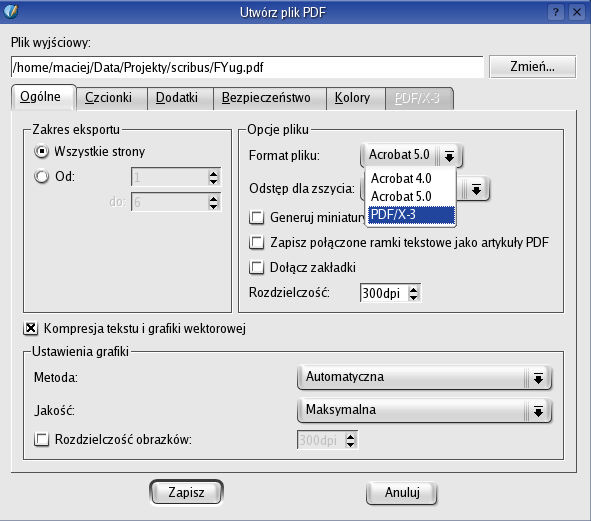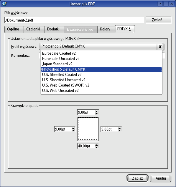 [PDF dla druku] Najwspanialszą właściwością Scribusa jest możliwość tworzenia plików PDF, które mogą być przekazane bezpośrednio wydawnictwu albo drukarni do produkcji. Tak jest, PDF istnieje w wielu wariantach. Nie ma formatu pasującego do każdej sytuacji. Wariant dla przygotowania do druku nazywa się PDF/X-3. Oznacza to w skrócie PDF bazujący na języku Postscript Language 3, zawierający profile barwne ICC, pozwalające na wykorzystywanie zarządzania kolorami w kolejnych krokach obróbki. Gdziekolwiek na tej planecie.