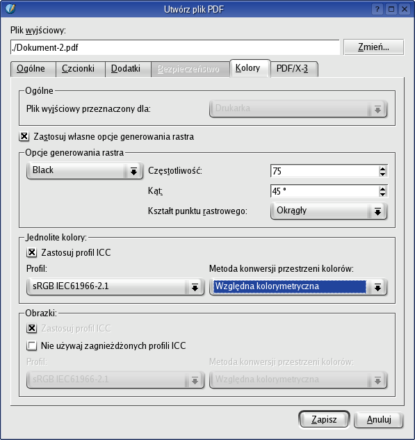 [Zarządzanie kolorami] W karcie wybierz zagnieżdżanie wszystkich czcionek. Następnie kliknij na . Zauważ, że możesz użyć źródłowego profilu ICC dla twojego pliku, wybrać metodę konwersji oraz zdecydować, czy używać profilu źródłowego obrazków, czy też wybrać własny profil. Jeśli tego nie rozumiesz, nie przejmuj się. Jest to dosyć proste.